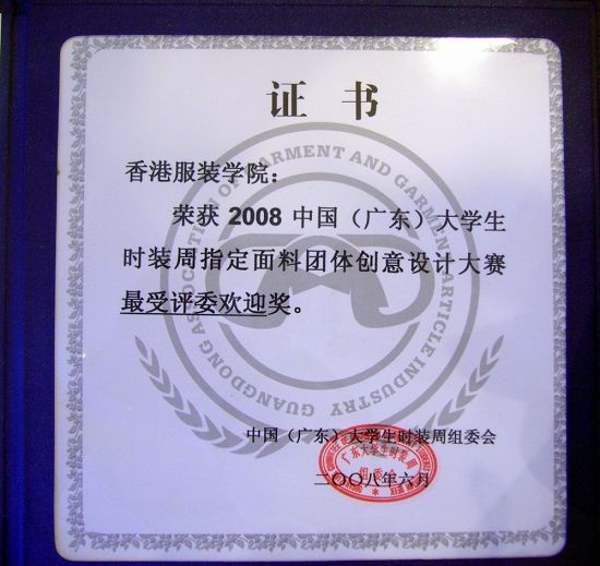 2008广东大学生优秀服装设计大赛暨指定面料团体创意设计大赛”最受评委欢迎奖“